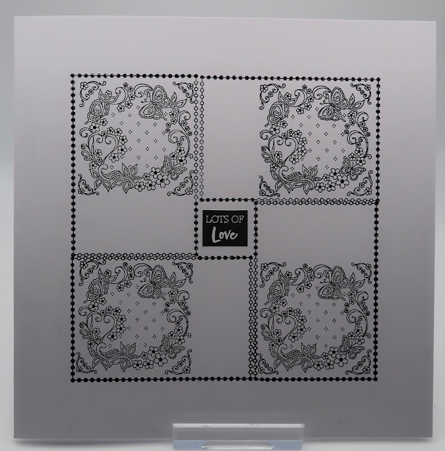 For this sample using the French Lace Sampler stamps I stuck with a monotone theme.Add one of the frames from the French Lace Sampler stamp set onto the front of a 7” x 7” white card blank in Jet Black Archival ink. In the corner, 1” in from each edge using a stamp platform.Turn the card and stamp three more times to create a 6” x 6” outer frame.Add one of the square stamps from the same set into the top left corner of the frame in the same ink.Add the same stamp into the bottom right-hand corner.Repeat in the remaining corners.Colour the dots round the outer and inner edges and the centres of the flowers using a black Posca pen.To finish, add a Pinky Gray Greetings sticker into the centre frame.